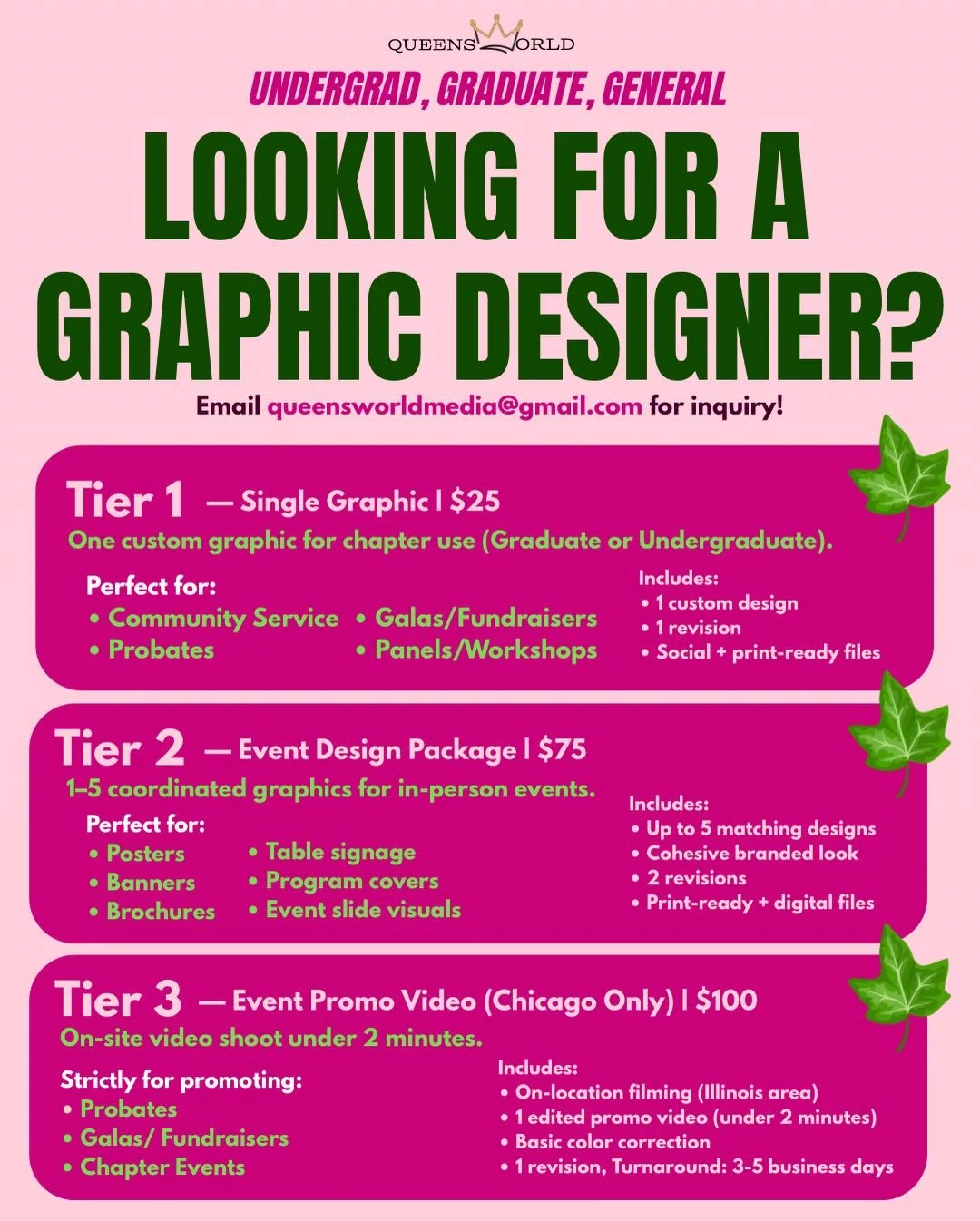 Schedule a creative video session for your brand, family, wedding, & more! Package includes a creative direction mood board that helps with style, poses, & props. You will receive (1)under a minute video and (1)over a minute video with edits with a 5 day turn around.